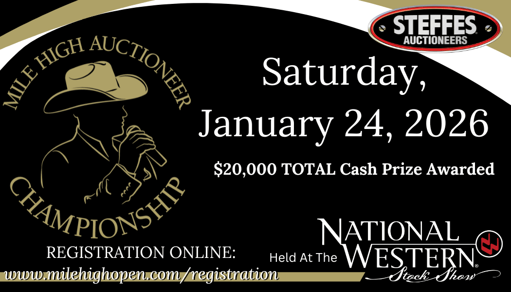 2026 Steffes Group Mile High Auctioneer Championship® held at the National Western Stock Show with $20,000 Prize Money To Be Awarded! About this event The Steffes Group Mile High Auctioneer Championship® is an open, auctioneer competition that will be held on Saturday, January 24, 2026 @ 3 PM during the National Western Stock Show in Denver, […]